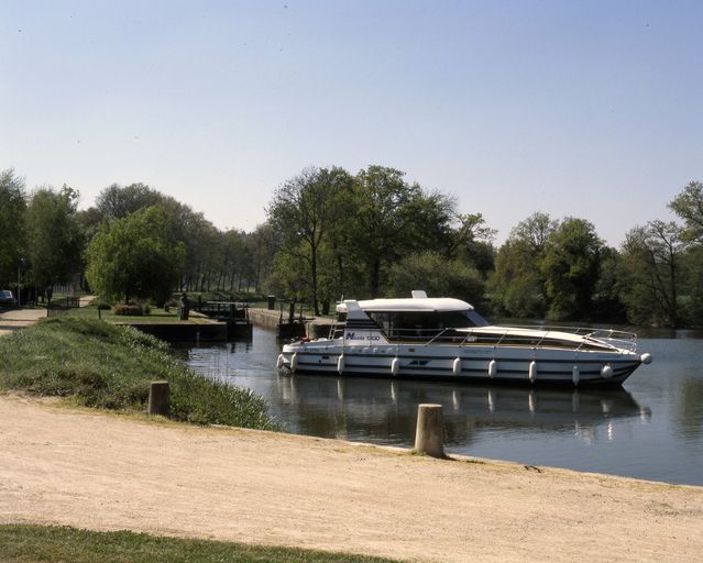 Écluse à sas ; pierre de taille de granite ; pare-gravier : moellon de schiste (?), parements : grand appareil de granite ; bittes d'amarrage. État actuel : écluse électrifiée Déversoir rectiligne. Vanne contre la rive opposée à l'écluse ; culée et îlot : pierre de taille de granite. État actuel : passerelle et vannes métalliques. Embarcadère à 70 m en amont. Bac (public) à 100 m en aval.