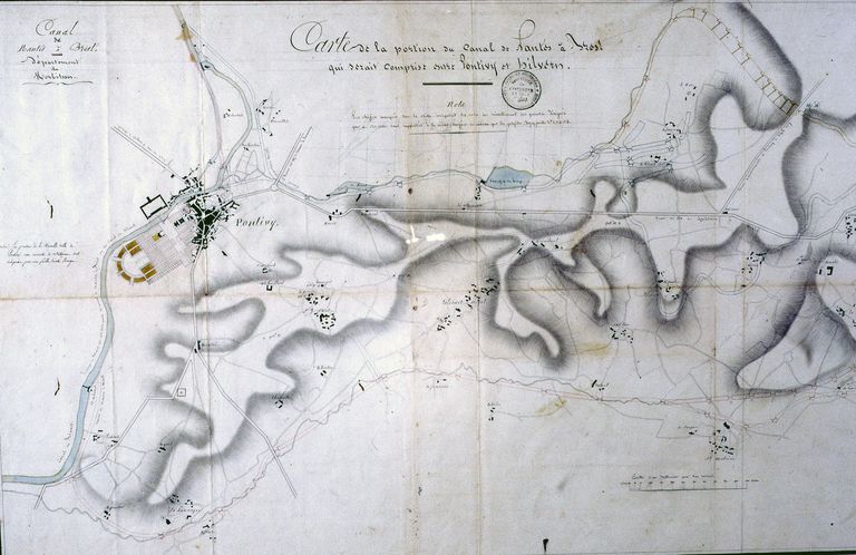 Canal de Nantes à Brest. Département du Morbihan. Carte de la portion du canal de Nantes à Brest qui serait comprise entre Pontivy et Hilvern. Plan, par Lenglier, ingénieur en chef des Ponts et Chaussées, 15 décembre 1825. Papier, encre, aquarelle, 57x138 ; échelle : 1 : 10000.