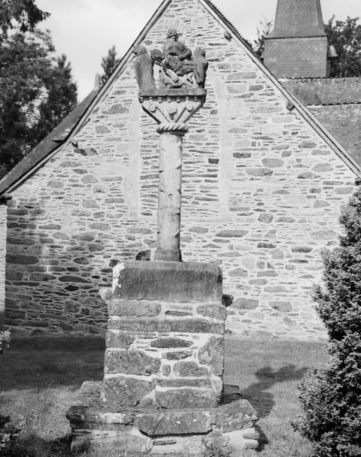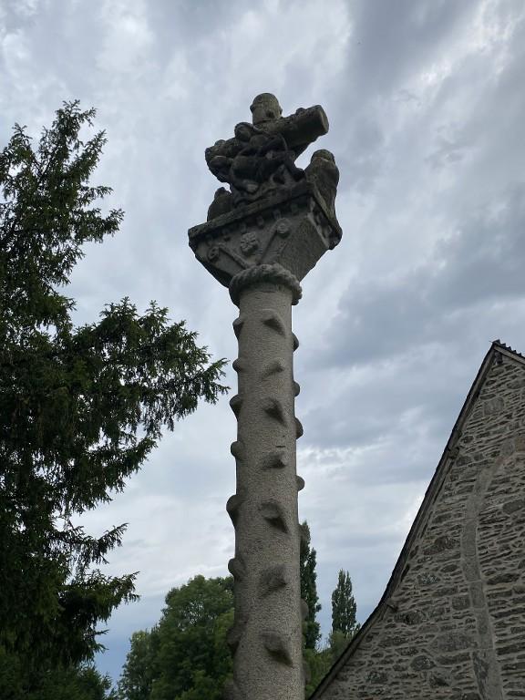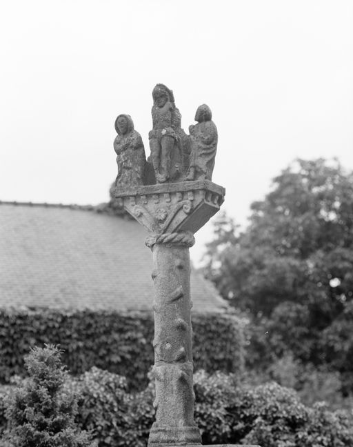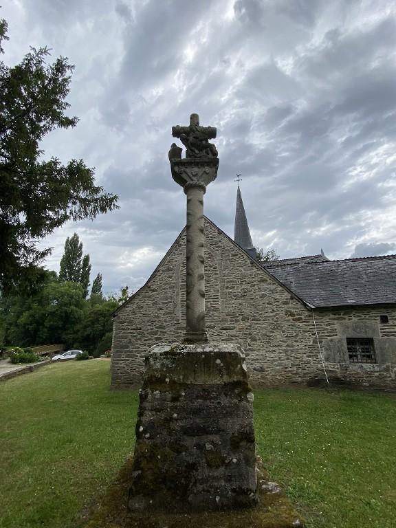 Croix en granite monolithe sur socle, soubassement de maçonnerie et emmarchement qui servait peut-être de table d'offrande ; fût en granite, de section circulaire, écoté ; il est cassé. Décor en haut-relief ; sur une face : Calvaire, dont le Christ a les pieds posés l'un sur l'autre ; sur l'autre face : Vierge de Pitié.