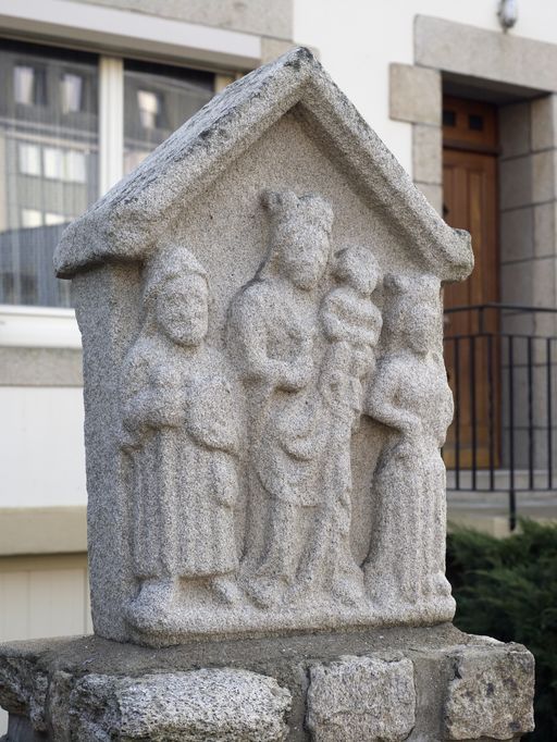 Croix-tableau à bâtière. Décor en haut-relief ; sur une face : Calvaire ; sur l'autre face : Vierge à l'Enfant, sainte Catherine d'Alexandrie, saint Jacques le majeur.