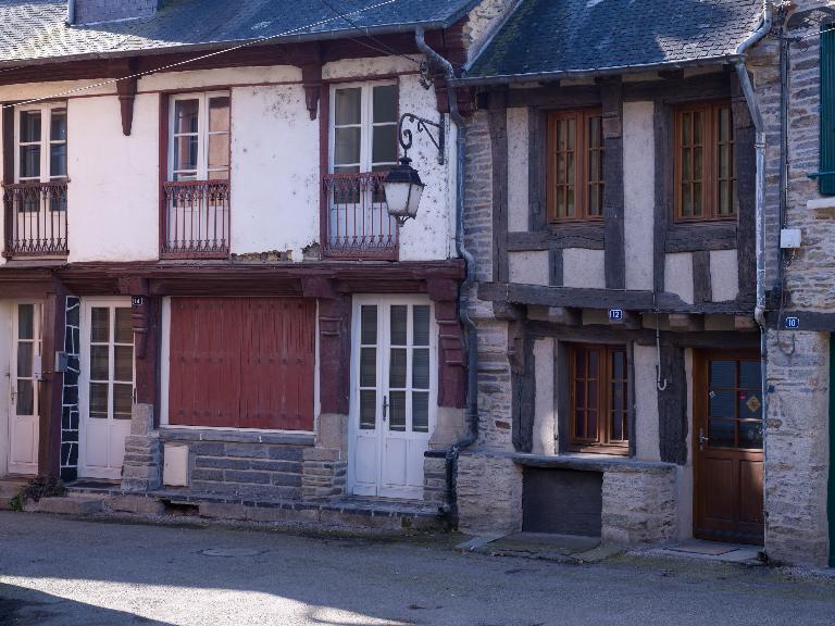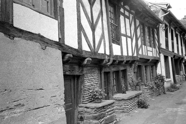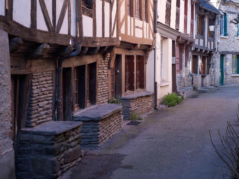 Dès le début : maisons n° 8 et 10, on trouve des vestiges de pan-de-bois. Les édifices suivants, toujours sur le même côté de la rue, sont mieux conservés et associent le pan-de-bois à des étals de schiste gris, parfois posés au-dessus de l'accès vers la cave, montrant ainsi qu’on se trouve en présence d’anciennes boutiques.