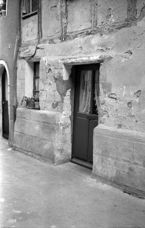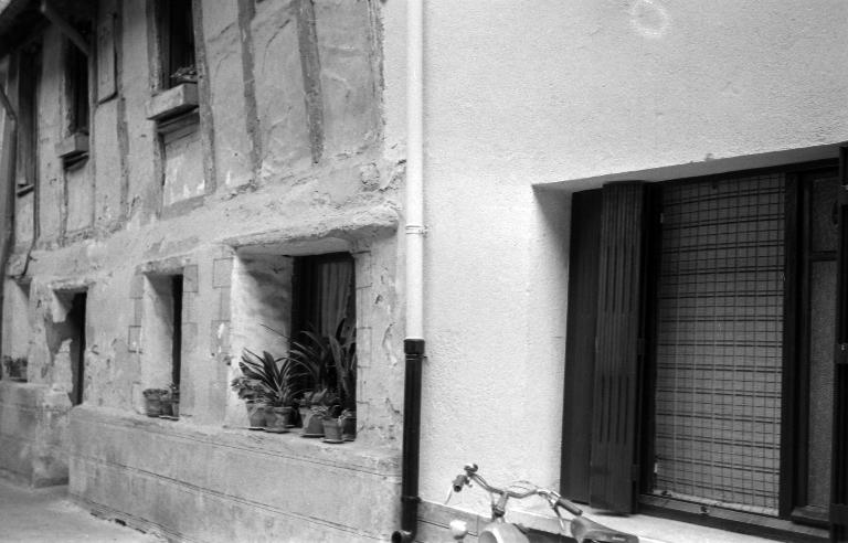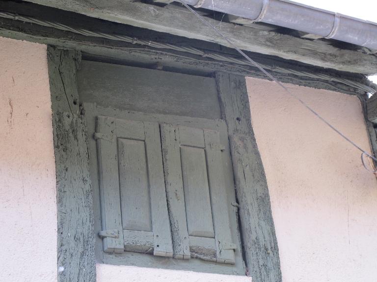 Au premier étage, les fenêtres, agrandies, alternent avec des panneaux de torchis enduits. On a conservé deux ouvertures d'origine aux volets de bois anciens.