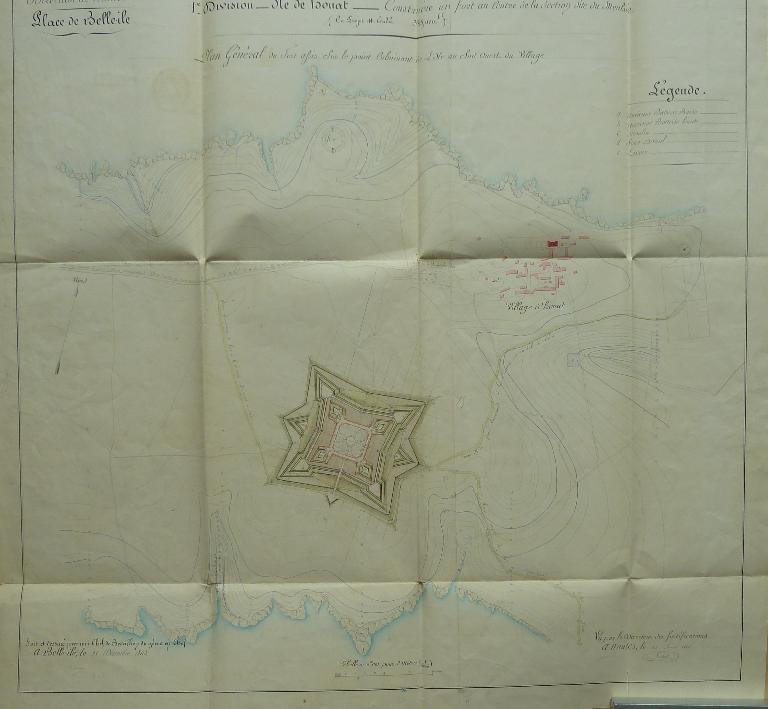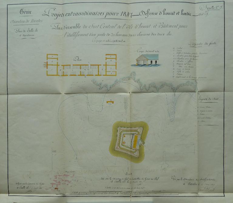 Service historique de la Défense, département Armée de Terre, Vincennes. Archives du Génie ; Article 12, Avis du Comité : 1 VK 582, Registre des avis du Comité des fortifications sur le crédit général pour la défense des côtes, 1846-1849. Séance du 8 juillet 1847, Dépendances de Belle-Ile (Houat-Hoedic).
