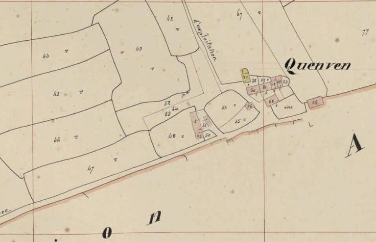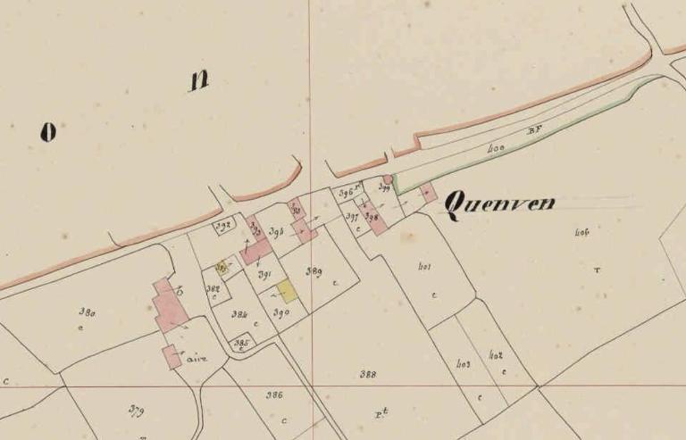 Au nord, les écuries, donne sur la cour de la ferme (?) enclose avec logis à étage de type ternaire orienté au sud et dont l'accès se fait par un portail à piliers à l'est.