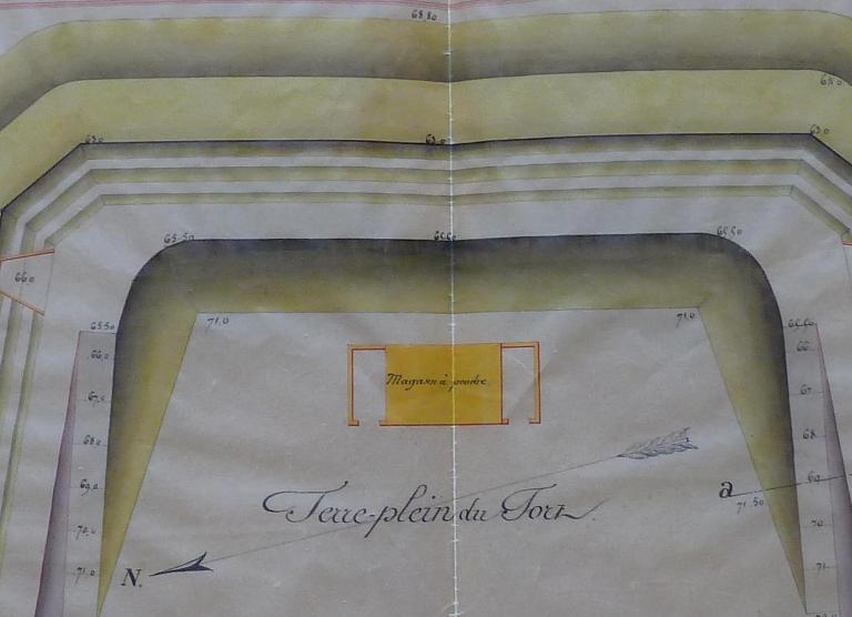 Le magasin à poudre du fort central d'Houat est placé au centre de la cour, appuyé contre le massif terrassé du cavalier d'artillerie.