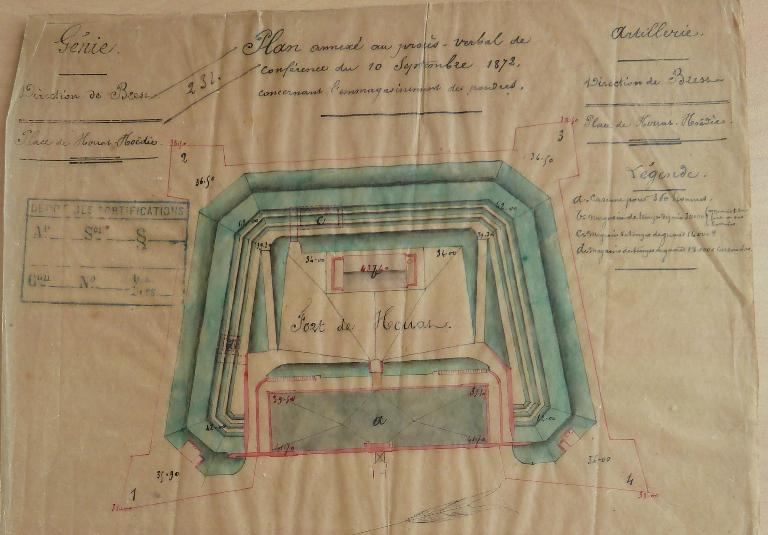 Le magasin à poudre est l'un des derniers éléments construits du fort central de l'île d'Houat, en 1855-1856, bien qu'il fasse l'objet de projets depuis 1846.