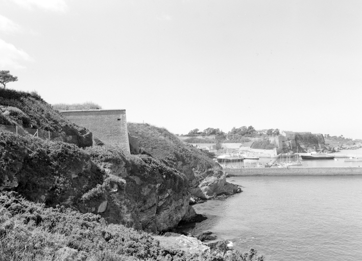 Une première tranche de travaux s'achève en 1845, mais des éboulements de l'escarpe en rocher obligent à la reconstruire à partir de 1846 entièrement en maçonnerie en avant de son premier tracé. Les travaux se poursuivent, ralentis par la nécessité d'excaver de nouveau la roche et le manque de crédits, jusqu'en 1856-1857. Le tracé évolue peu durant cette période, hormis la suppression du cavalier prévu à l'extrémité gauche, et l'aménagement d'un chemin de ronde avec mur à bahut au sommet de l'escape, transformant ainsi l'ensemble du parapet en cavalier. La porte de Locmaria est définitivement aménagée en 1849-1850 à l'extrémité droite de la courtine.