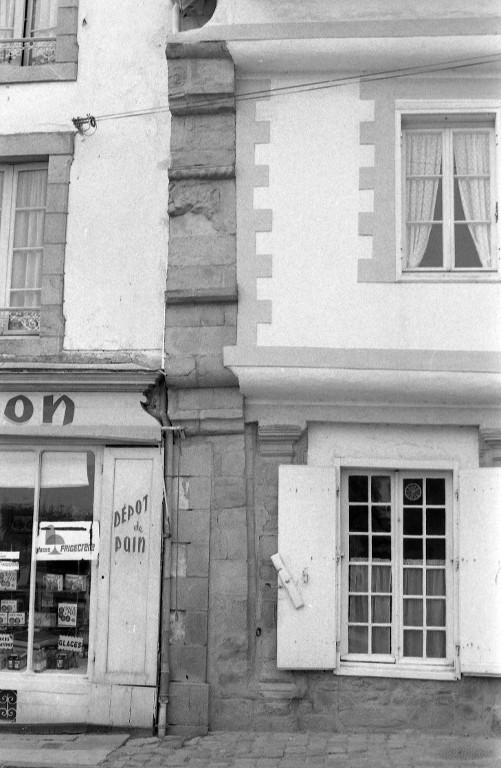Des piliers en forme de pilastres divisent le rez-de-chaussée en trois travées : deux baies à vocation commerciale et la porte d'entrée à droite. Celle-ci ouvre sur un couloir séparé du commerce et qui donne accès à l'escalier à vis. L'étage et le surcroît sont construits en pan de bois en encorbellement et s'ancrent dans les murs gouttereaux. Les clichés de 1978 depuis les combles indiquent un pan de bois en chevrons, masqué à l'extérieur par un enduit. Le fenestrage actuel de l'étage ne correspond pas aux dispositions d'origine. Un essentage d'ardoises couvre les combles.
