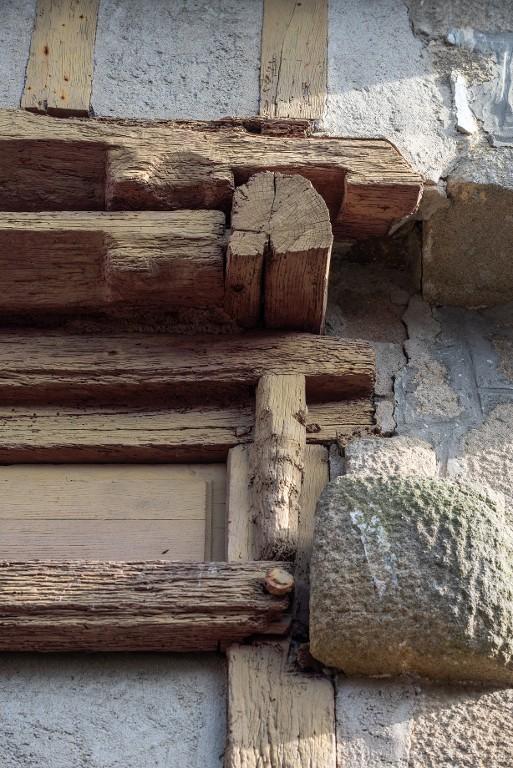Façade principale en pan de bois : l'étage et le surcroît sont construits en encorbellement avec entretoises, encadré par deux murs à ressauts. Des pilastres en pierre témoignent d'une reprise du rez-de-chaussée et structurent les ouvertures avec une fenêtre à étal de chaque côté de la porte centrale. La sablière de plancher est retournée : les assemblages en queue d'aronde sont visibles. Ils servaient auparavant à bloquer les solives. Les entretoises sont simplement chanfreinées avec congés.