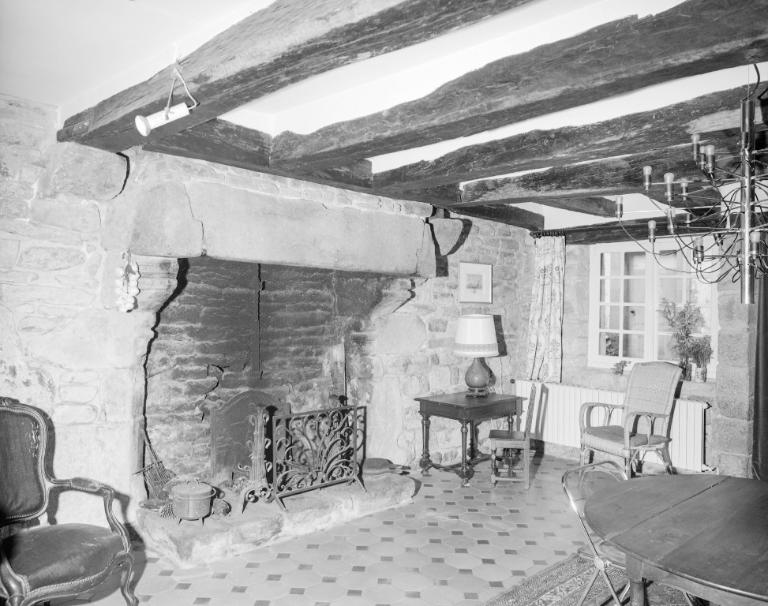 Des parquets ornementaux postérieurs habillent le rez-de-chaussée. Un vaisselier et une cheminée apportent du confort. L'escalier en vis donne accès aux étages. Une œuvre en céramique contemporaine occupe le fond de la cheminée du premier étage.