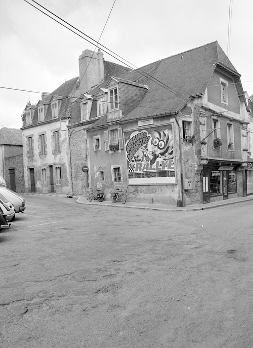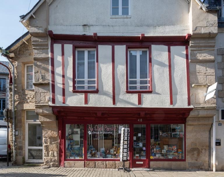Cette maison d'angle se compose d’un rez-de-chaussée, d’un étage carré et de combles à surcroît. La façade rue du Belzic est en pan de bois, encadrée par deux gouttereaux maçonnés à ressauts. Des vitrines sur un mur bahut contemporain occupent le rez-de-chaussée commercial. Un poteau cornier d’origine subsiste à gauche, surmonté d'une console prismatique baguée.