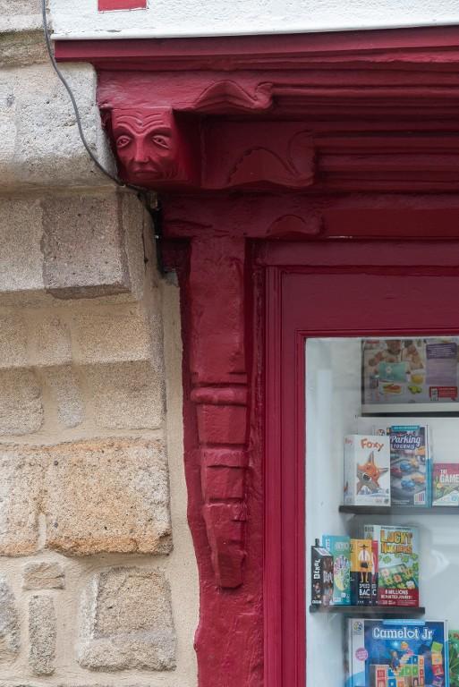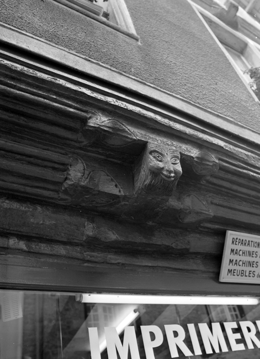 L’étage repose sur un encorbellement sur solives avec entretoises. L’ensemble de ces pièces est chanfreiné et mouluré avec un décor de feuillage sur les congés. Les visages sculptés sur les abouts de solives sont postérieurs. Les entretoises du second encorbellement sont moulurées plus simplement.