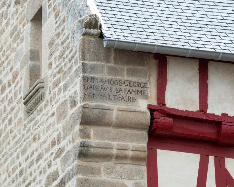 Le mur gouttereau porte l'inscription : " EN MAY 1608 GEORGE GAREAU (et) SA FEMME MON FAICT FAIRE ". En 1615, Georges Gareau est député par la communauté de ville pour participer au choix des parcelles destinées à accueillir le couvent des Capucins (Shapa, Les Capucins d'Auray, novembre 1999) tandis que des audiences de la Sénéchaussée d'Auray menées en 1630 mentionnent Jacquine Jémaux, "veuve de honorable homme Georges Gareau", comme propriétaire de cette maison (AD56, B 1399).
