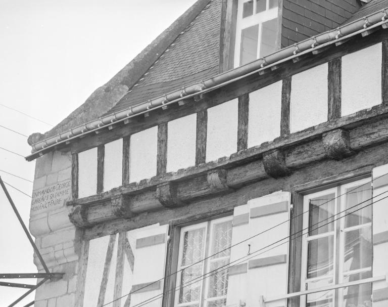 Maison à gouttereau sur rue dont les pignons à ressauts accompagnent la façade en pan de bois en encorbellement. La porte d'entrée se situe à droite ; trois fenêtres de gabarit similaire éclairent le rez-de-chaussée maçonné, dont l'une agrandie sert de seconde porte. Une entrée de cave et un soupirail signalent l'existence d'un sous-sol. Une fenêtre à appui mouluré s'ouvre dans le pignon dans la ruelle au Duc.