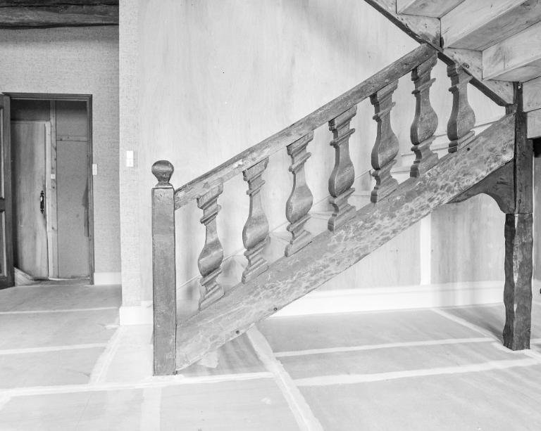 Typologiesmaison d'angle à 1 façade de pierre ; mur pignon en façade principale ; 2 encorbellements ; escalier de bois à balustres carrés
