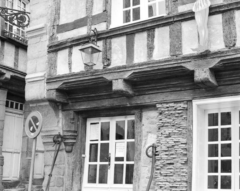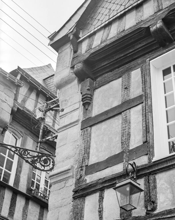 La jonction entre les deux façades en pan de bois place Saint-Sauveur est assurée par une croix de Saint-André au premier étage et le prolongement des sablières et entretoises du n°21 qui font la liaison structurelle et visuelle au niveau des encorbellements.