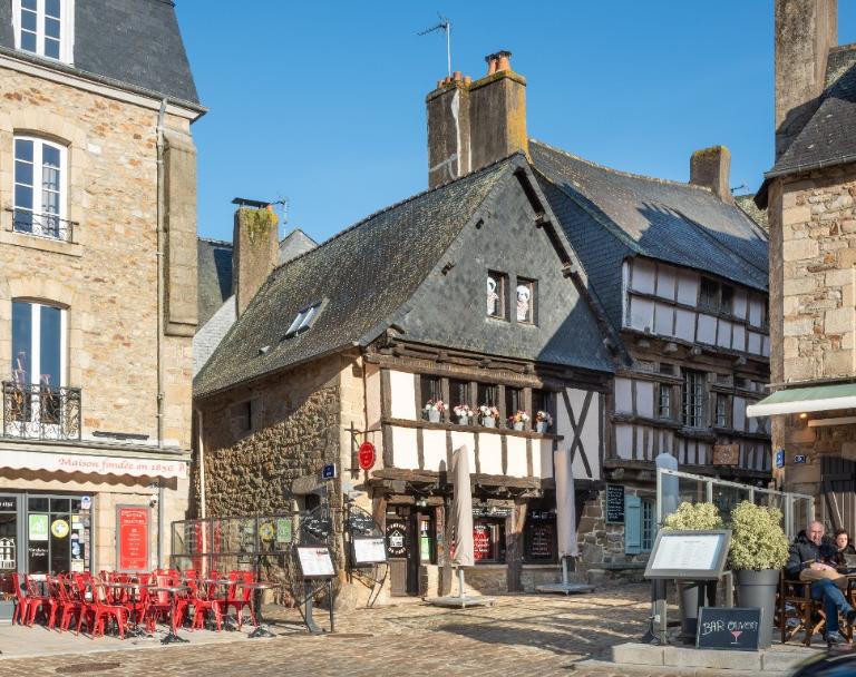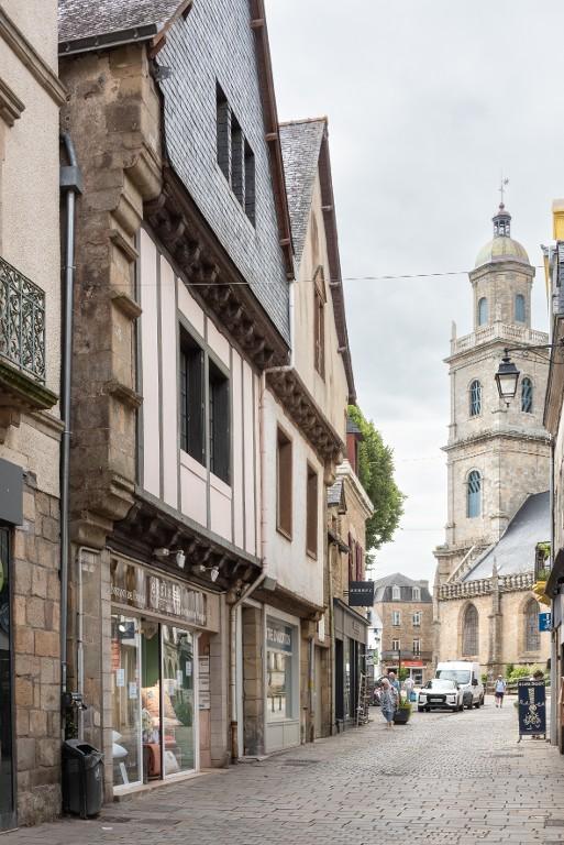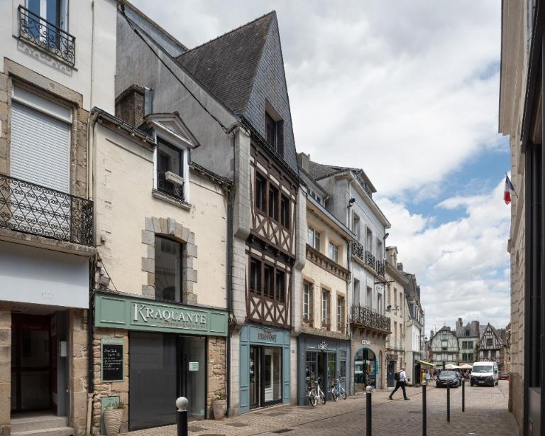 Des représentations de la rue Neuve signale deux maisons disparues à façades droites, dont l'étage repose sur deux sablières superposées (pas d'encorbellement ni d'éléments intercalaires visibles comme des abouts de solives). D'autres façades droites, en grande parties reprises, s'observent 6 rue Jean-Marie Barré et 14 rue Neuve. Des pastiches en faux pan de bois remplacent d'anciennes façades comme au 3 place de la République et au 51 rue du Petit Port. D'autres sont très reprises, avec une importante proportion de bois neufs : 21-23 rue du Petit Port, 1 place de la République, 13 rue au Lait...Le pan de bois du 13 rue du Belzic a même été évidé à l'étage, avec des fenêtres installées en retrait.