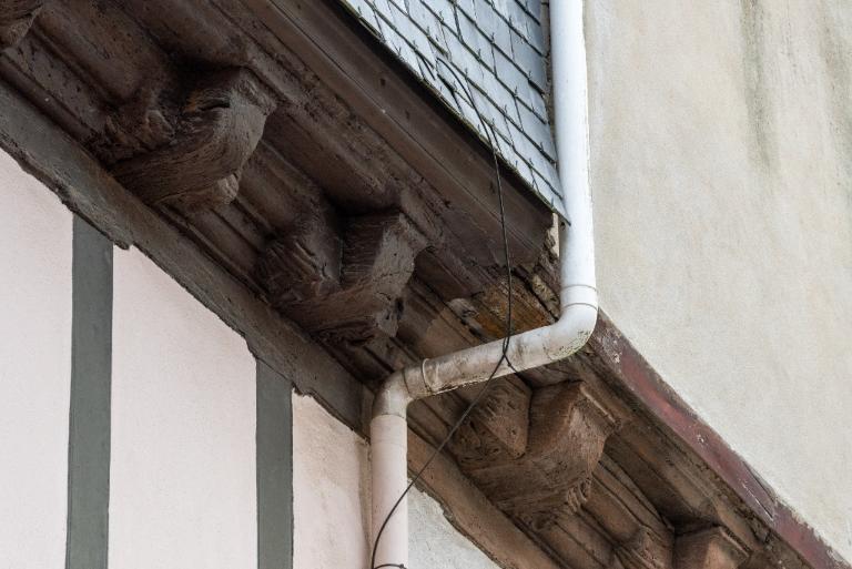 Le décor extérieur se concentre sur les entretoises, les sablières de chambrées et les murs latéraux. Le motif losangé incluant une feuille se retrouve sur plusieurs édifices, sur les entretoises comme les murs qui encadrent le pan de bois (1-3 place de la République, 21-23 rue du Petit Port, 6 rue du Château). On le repère aussi en quatre exemplaires sur le manteau d'une cheminée portant la date de 1537 entourant un médaillon au 25 rue du Lait. Inscriptions et armoiries trouvent également place de part et d'autre des façades principales, souvent à hauteur du premier étage comme au 56-58 rue du Château, 6 rue Neuve, 1 rue Jean-Marie Barré ou le 16-18 rue du Château (cette fois au niveau du surcroit). Dans l'ensemble, les ornements qui nous sont parvenus relèvent du registre géométrique (godrons, écailles, losanges, pilastres, consoles baguées...). Une maison fait figure d'exception avec ses visages humains et ses animaux sculptés dans la pierre, sous la toiture et le long de la lucarne (21 rue du Docteur Alexandre Jardin).