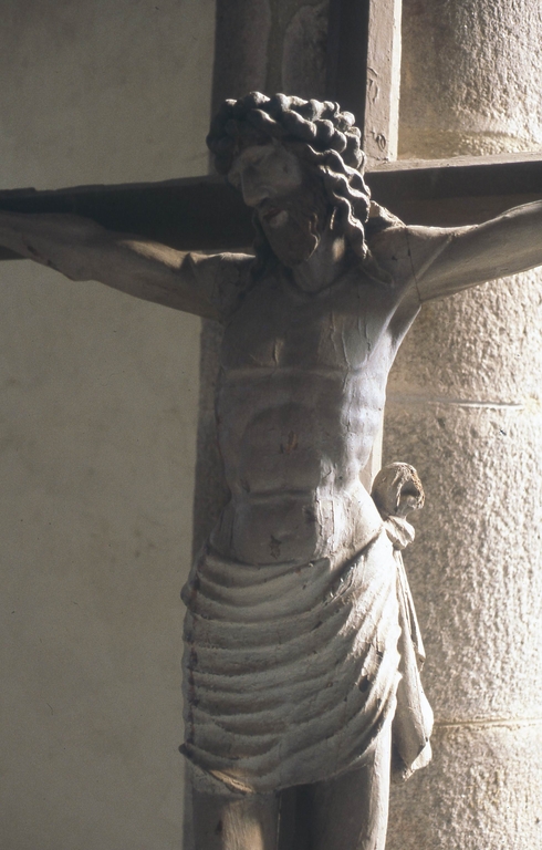 Revers évidé au niveau du torse. Assemblage des bras, du noeud et du pan latéral du perizonium ; pièce rapportée pour chevelure, barbe et partie droite du visage ; mortaise au sommet du crâne et aux extrémités de la croix.