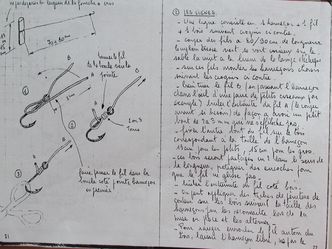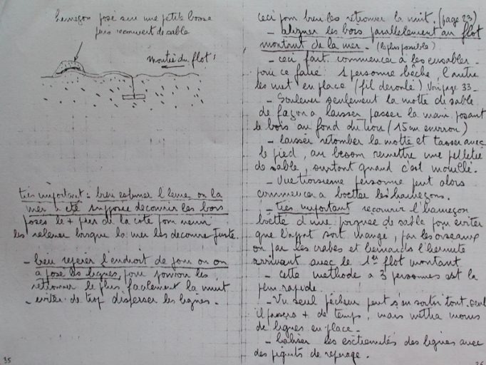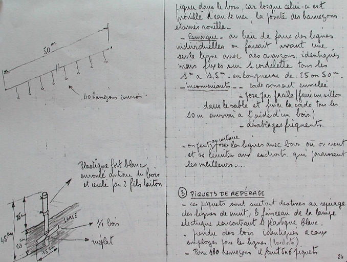Témoignage de M° Hermange : Les lignes étaient bouétées avant au défoulage, levées à la marée le jour même. Elles étaient gréées de 300 hameçons. Les vers de vase sont ramassés à la bèche et conservés dans des boîtes en bois. Jean Aubry et Jean Guihot de la Cotentin mettent régulièrement des lignes de fond ou arouels avec des bois, comme les paillons ou encore le goémon utilisés autrefois, pour enfoncer les lignes individuelles.