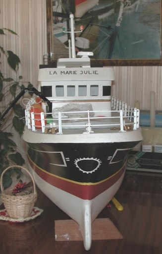 Maquette navigante d'un bateau de pêche au large, du type chalutier "nouvelle génération", avec pont couvert et cabine centrale, de l'armement Porcher de Saint-Brieuc, qui a remplacé les chalutiers traditionnels. Cette maquette a été réalisée par le charpentier de marine Robert Bouguet.