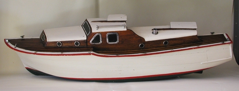 Demi-coque démontable en bois tranché à tableau, avec superstructures (cabine fermée sur coque pontée). Dimensions : longueur : 70 cm ; largeur : 13 cm. La coque est peinte en vert sous flottaison et en blanc pour la partie émergée. La cabine est en bois vernis. Il manque cependant la quille, qui a été arrachée.