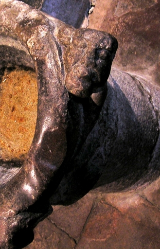 Bénitier en granite monolithe à pied circulaire et fût cylindrique. Vasque circulaire et quatre personnages inscrivant l'ensemble dans un carré. Le bord de la vasque porte des traces d'usure qui peuvent résulter de l'affûtage traditionnel des outils après trempage dans l'eau bénite.