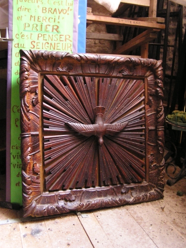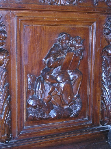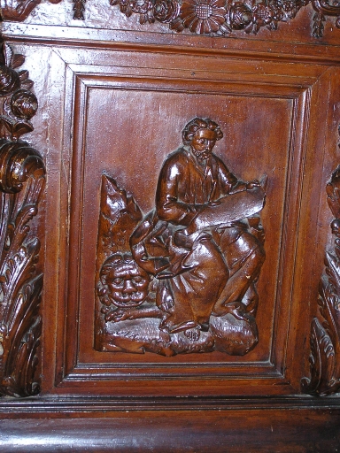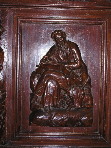 Vestige de la chaire à prêcher dont reste la cuve polygonale. Autrefois fixée à un pilier nord, déplacée au départ de la nef côté sud. Panneaux sculptés représentant 3 des 4 Evangélistes : Matthieu, Marc et Luc. L'abat-son est déposé dans le grenier du clocher.