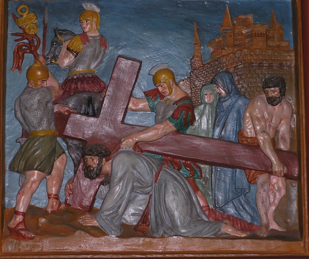 Chemin de croix dont les 14 stations sont des panneaux de bois sculptés en bas-relief et polychromes, disposés sur les piliers des bas-côtés et au fond de l'église.