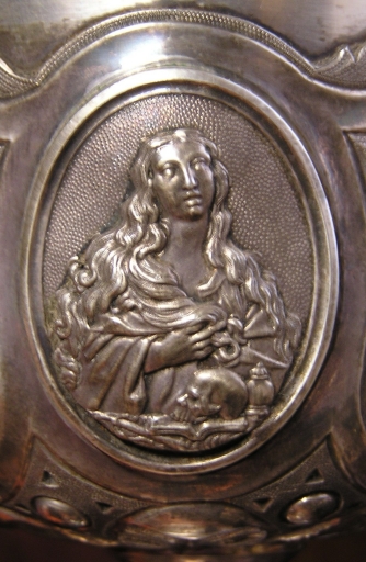 Sur la fausse-coupe, motifs de raisins, roseaux et blés et 3 médaillons : Education de la Vierge, moine tenant un crucifix, saint Jean à longue chevelure. Sur le noeud, décor de blés, raisins et roseaux. Sur le pied, roseaux, raisins et blés en alternance avec 3 médaillons en buste : saint Jean, saint Pierre et saint Paul.