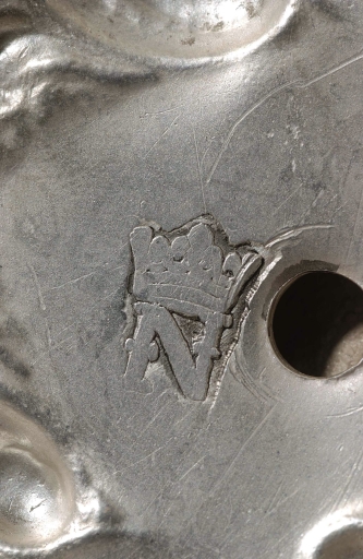 Poinçons (sur la coupe et la patène) : initiales L et R séparées par une hermine, surmontées de deux grains de remède et d'une fleur de lys, maître Louis Le Restif ; marque de Saint-Brieuc, 1697 : B couronné entre deux hermines, un soleil en pointe ; contremarque de Rennes : une couronne. Inscription : DONNE PAR MADAME PERRINE FRELONNIERE AUX DAMES RELIGIEUSES de MONCONTOUR (sous la base).