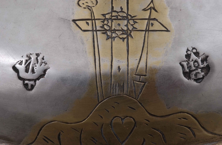 Poinçons (sur le pied) : initiales H et L séparées par un point, lettre G en pointe, hermine en chef, maître Hugues I Lossieux ; poinçon de communauté de Saint-Malo : un bateau surmontant la lettre T, 1630-1631.