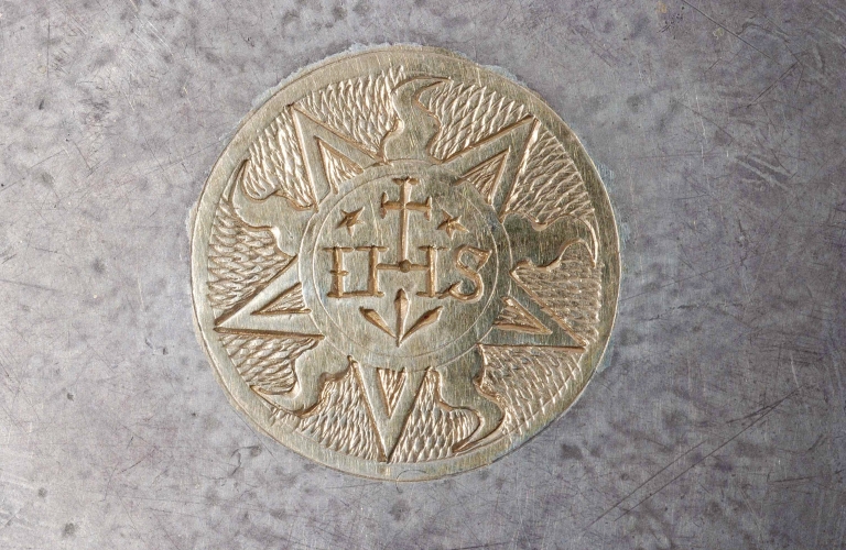 La lance, l'éponge, la croix et la couronne d'épines, ciselés sur le dessus du pied de part et d'autre. Coeur.