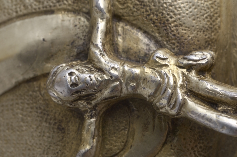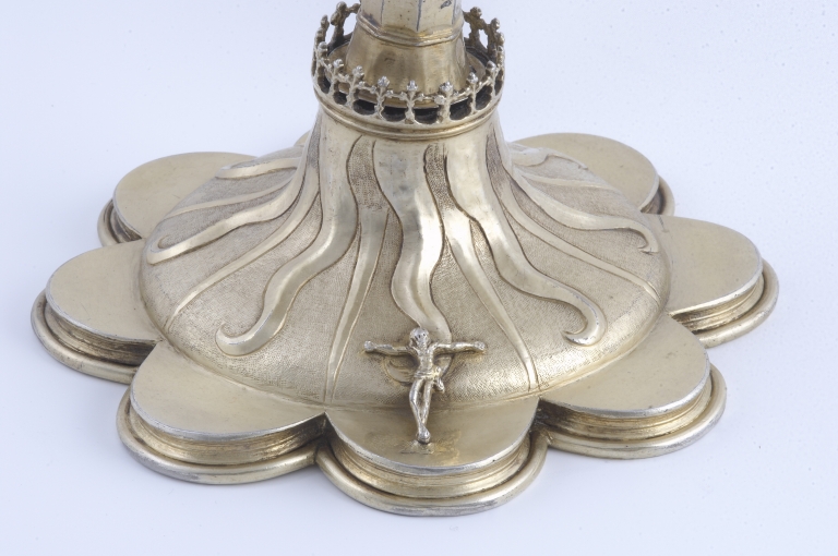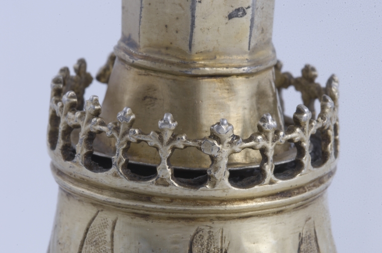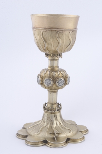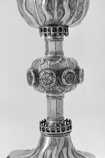 Bien que ne portant pas de poinçons, ce calice d´une belle qualité d´exécution présente le grand intérêt d´être daté, de 1594, par une inscription gravée sous le pied. Celle-ci fait état de la donation de l´objet par la fille de Charles Marot, riche dinannais appartenant à une famille qui compte à la fin du XVIe siècle plusieurs syndics de la ville ainsi qu´un sénéchal anobli par Henri IV en 1598. Les armoiries gravées sur le pied -une main dextre accompagnée d´une étoile- sont celles de cette famille bourgeoise en voie d´anoblissement qui eut un rôle de premier plan dans les fondations hospitalières de la ville entre le XVIe et le XVIIIe siècle. Les boutons du noeud gravés de quintefeuilles portant des traces d´émail, s´inscrivent encore dans la tradition gothique. Par contre, le décor de rayons et de flammes qui orne le pied, le noeud et la fausse coupe, présent sur les oeuvres rennaises du milieu du XVIe siècle, est encore employé à Paris à la fin du siècle, ainsi que le montre le calice de Fréhel, réalisé en 1597 par l´orfèvre parisien Jérôme Acher. L´emploi de couronnes ajourées au sommet du pied, inconnu à Paris, se retrouve dans les calices nantais de la même époque, ainsi que sur un calice de Corentin le Baron, orfèvre de Quimper, daté de 1583. Ici, de façon originale, la même couronne, inversée orne à la manière d´un lambrequin la partie inférieure de la fausse coupe.. Il convient de noter que ce calice se démonte entièrement à l´aide de pas de vis, celui qui se trouve sous le pied comportant une pièce soudée à l´équerre pour former clef. Ce principe rappelle celui de plusieurs calices de Basse Bretagne de la même époque, dont le pied pouvait éventuellement servir de support pour un ostensoir. C´est peut-être ici le cas de cet objet.