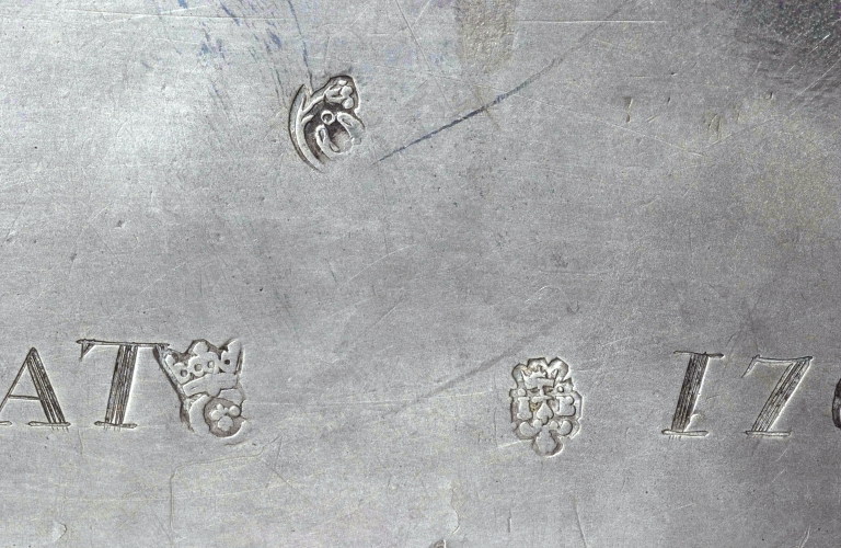 Poinçons (sous le fond) : initiales I et B séparées par une hermine, 2 grains de remède et une couronne au dessus, un cul de lampe au dessous, maître Jean Buchet ; communauté de Rennes, 1698-1699 : lettre C couronnée accostée d'une hermine ; charge de Rennes : 9 fleuronné ; inscription sous la base : ST JUVAT 1700 ; inscription sur les ampoules : OS STUM OLUM SCH STM CH MA S JUVAT 1700.