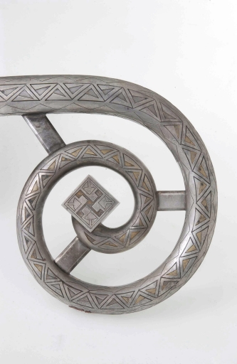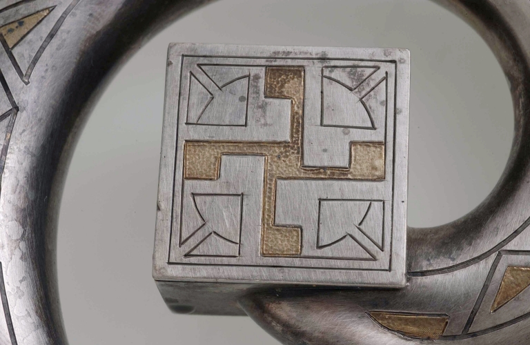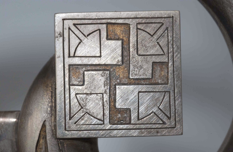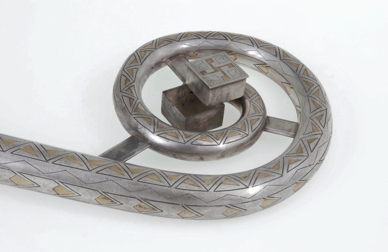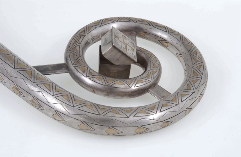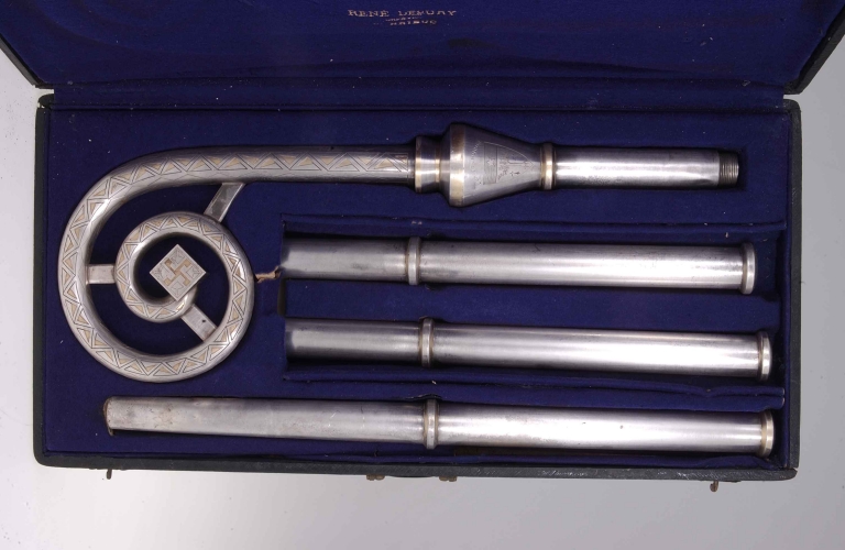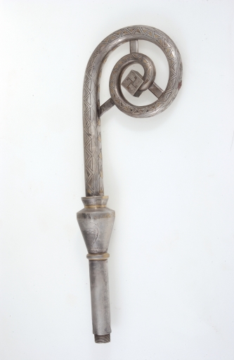 Réalisée en 1929 pour Monseigneur Tréhiou évêque de Vannes sur des dessins de l´architecte James Bouillé, cette crosse pastorale est une œuvre emblématique. L'objet ne porte pas le poinçon du fabricant Desury de Saint-Brieuc, identifiable par sa forme rectangle aux angles abattus à droite, mais deux poinçons losangiques non identifiables qui semblent indiquer que la fonte en a été confiée à un autre atelier. En revanche le décor gravé, réalisé postérieurement à l'apposition du poinçon de contrôle, et certainement de la main-même de René Desury, prend une importance telle qu'elle permet de lui attribuer la paternité de l'objet. Son style illustre parfaitement la volonté de ce créateur, associé à plusieurs artistes et artisans, dans le cadre de l´Atelier Breton d´Art Chrétien, de renouveler de façon radicale les formes et les objets de l´art sacré en puisant aux sources de la tradition bretonne. Elle incarne aussi l´ambition de ce groupe, proche de celui des Seiz Breur, d´étendre à l´ensemble des arts, y compris le mobilier et les objets un renouvellement des formes qui se veut en rupture avec les productions pompeuses néo-romanes et néo-gothiques répandues de façon indifférenciée par les fabricants sur l´ensemble du territoire. Le crosseron, dont le simple enroulement, consolidé par des renforts, s´inspire des modèles purs du XIIIe siècle, est orné d´un décor gravé à base de triangles et de lignes brisées, qui appartient pleinement au répertoire ornemental de ce mouvement. La qualité de la gravure, de même que la maîtrise de la dorure réservée aux triangles, révèle ici le métier accompli de l´orfèvre René Desury, et sa connivence avec le concepteur. Toutefois, la confrontation entre les dessins très précis de James Bouillé et l´oeuvre réalisée fait apparaître une différence importante. Le projet initial qui prévoyait crosseron et noeud à pans coupés, choix qui devait magnifier l´esthétique de l´objet, fut en fait simplifié au profit d´une section circulaire, probablement plus aisée à obtenir en fonte. Le carré posé sur la pointe, au centre de la volute, est orné d´un hévoud apposé sur une croix inscrite dans un cercle. Cette référence à l´église primitive d´Armorique s´explique d´autant plus que cet ornement cache un réceptacle, escamoté par un ajustage parfait, permettant probablement d´y abriter un petit reliquaire.