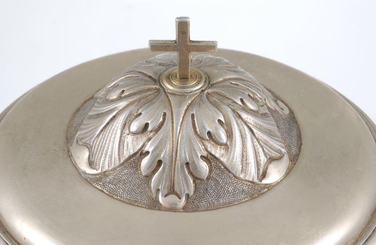Cette pièce est représentative des oeuvres simples mais de bonne qualité réalisées pendant la première moitié du XVIIIe siècle. On y remarque le maintien d´un modèle globalement encore très XVIIe, qui s´écarte toutefois de ses références par quelques variantes de forme, de décor et d´exécution. La bordure du pied est très large, la cloche réduite, débordant par un encorbellement qui accentue le contraste, tandis que la tige, très discrète a perdu ses collerettes. La coupe est large, légèrement plus basse que sur les modèles du siècle antérieur et, surtout le couvercle s´est aplati. La bordure du pied, en large doucine reprend sans mise à jour le motif de la frise de feuillages estampés. L´examen de détail montre que, pour orner les écoinçons vacants entre les feuilles, l´orfèvre a utilisé un petit estampage en forme de godron qu´il devait par ailleurs employer pour orner des galons. Le décor ciselé qui orne le noeud et le sommet du couvercle est, selon la mode de l´époque détaché sur un bandeau mati. On a voulu voir dans cet objet une oeuvre des années 1730-1735 de l´orfèvre Louis Le Basteur installé à Fougères. Toutefois, l´étonnant poinçon à l´initiales V à pointe arrondie et chargée d´un point qui n´est probablement pas une lettre-date mais un poinçon du contrôle de la marque, pourrait fort bien plutôt s´appliquer à Vitré. Sachant que Louis Beaudoin, orfèvre dans cette ville y est, entre 1722 et 1726, commis aux contrôle des ouvrages et compte tenu de la qualité typographique du poinçon de maître qui comporte en outre quatre grains de remède au lieu des deux habituels, il semble plus cohérent de lui attribuer la paternité de l´oeuvre.