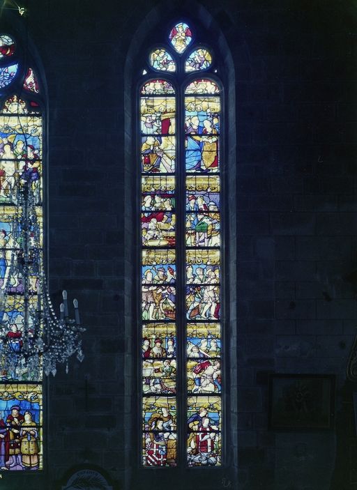 Vitrail de saint Mathurin divisé en deux lancettes comprenant chacune quatre panneaux. Vitrail de l'Arbre de Jessé divisé en trois lancettes. Vitrail de saint Jean-Baptiste divisé en deux lancettes décorées de dix scènes. Vitrail de sainte Barbe divisé en deux lancettes comprenant chacune quatre panneaux. Vitrail de saint Yves divisé en trois lancettes comprenant chacune trois scènes. Maîtresse-vitre comprenant une large bordure et un médaillon et cinq scènes réparties sur deux niveaux.