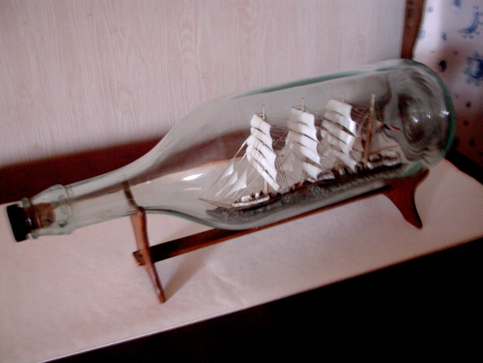 Deux maquettes de bateaux sous gobe (dits "bateaux en bouteille"), réalisées en bois, cordage en coton, voiles confectionnées en papier, enfermées dans une bouteille en verre, à culot plat. Ces maquettes "en bouteille" sont toutes relativement semblables de facture.