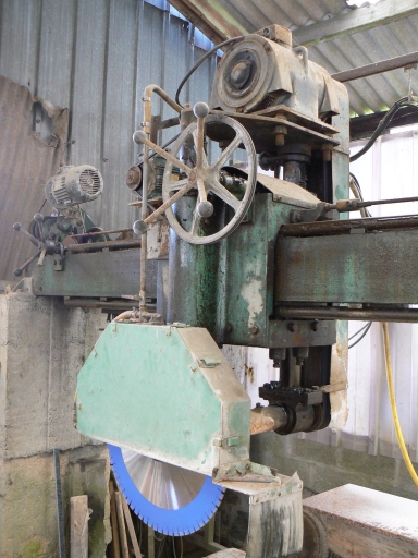 Cette débiteuse avec scie diamantée sert à découper des dalles de granit pour en faire des monuments funéraires. C'est un des premiers modèles produit par la société Gilbert de Fougères (35).
