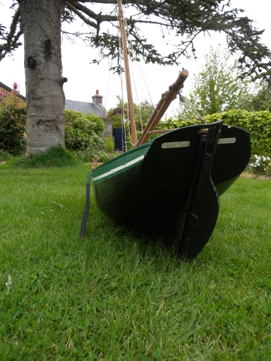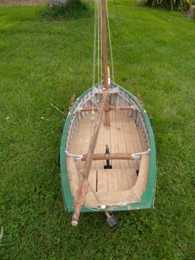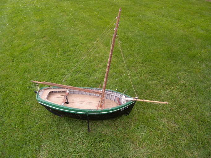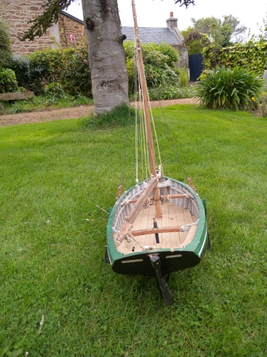 Cette maquette de bateau de pêche est construite en bois d'après un plan avec membrures et bordés. La coque est entièrement non pontée et gréée en sloop. Le fort échantillonnage de la charpente et les formes générales révèle la fonction du bateau : transport du goémon et pêche côtière aux casiers des grands crustacés. La coque creuse, sans pontage avant, permet de transporter une charge importante de goémon et de loger une quinzaine de casiers. Le bordé d'échouage et la grande largeur de la coque, avec un tirant d'eau modéré permettent des échouages fréquents et un grand volume de charge. Le grément de sloop peut être remplacé par un gréement de misaine selon l'usage. Les deux bancs ont des fonctions distinctes : le banc avant soutient l'unique mât et le banc arrière, creux, est équipé d'une pompe à mains. Le tableau est incliné et le gui dépasse largement le couronnement du tableau. Un long bout-dehors, rétractable, permet l'amurage des voiles d'avant. Ces bateaux très évolutifs étaient très polyvalents pour les pêches d'été et d'hiver.