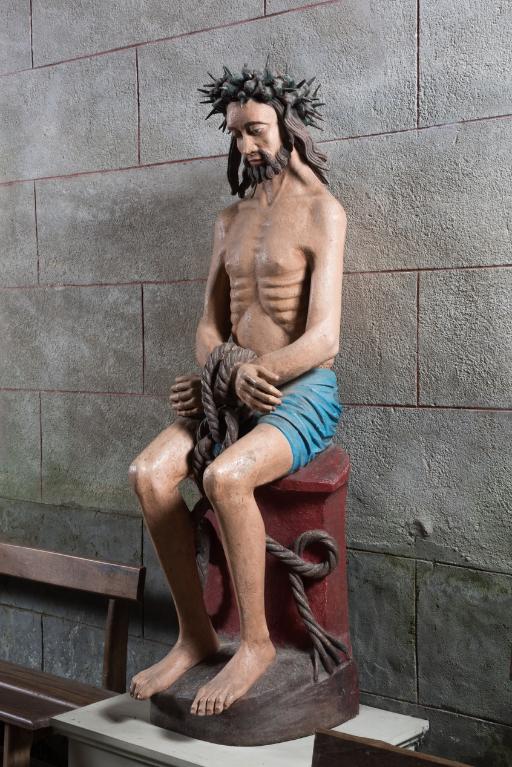 Le Christ est assis sur une caisse en bois. Il porte le perizonium. Son corps est maigre, on peut notamment compter ses côtés.