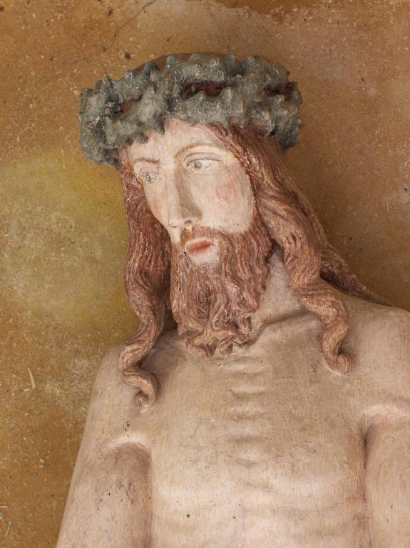 Le Christ est assis sur un muret en pierre. Il revêt le perizonium. On devine ses côtes.
