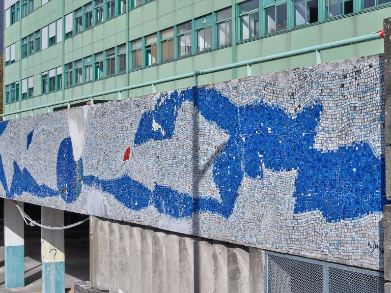 La mosaïque de Guingamp est tout aussi digne d'intérêt. Elle a cependant connu quelques désordres suite à la dilatation par la rouille des fers à béton du support. En 2020, l’œuvre a été "stabilisée".