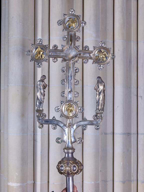 Dans les médaillons aux extrémités de la croix, figurent les symboles des quatre évangélistes (le bœuf de saint Luc, le lion de saint Marc, l'aigle de saint Jean et l'ange de saint Mathieu), iconographie traditionnelle à cet emplacement pour ce type d'objet au Moyen Âge. L'usage de la dorure fait ressortir ces motifs ainsi que les décors végétaux ornant le nœud. Des petites feuilles de vigne stylisées courent le long des bras de la croix et des consoles supportant saint Jean et la Vierge, venant atténuer la sobriété et le caractère géométrique de l'ensemble.
