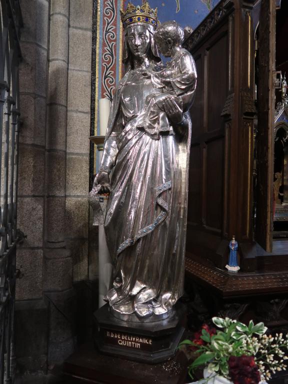 La commande de cette statue intervient suite au vœu solennel émis le 2 février 1871 par la population de Quintin, au moment de la guerre de 1870 et de l'annexion des Etats pontificaux. Il s'agit de se placer sous la protection de la Vierge, dans une période de crise, et de rétablir le culte de Notre-Dame de Délivrance dans l'ancienne collégiale. En échange de la grâce obtenue, les habitants promettent d’offrir un nouveau reliquaire pour contenir la relique de la ceinture de la Vierge. C'est peut-être à l'occasion de la bénédiction de ce reliquaire -également conservé dans la chapelle des fonts - qu'est offerte la statue qui porte à sa base l'inscription : "JUBILE 1875".