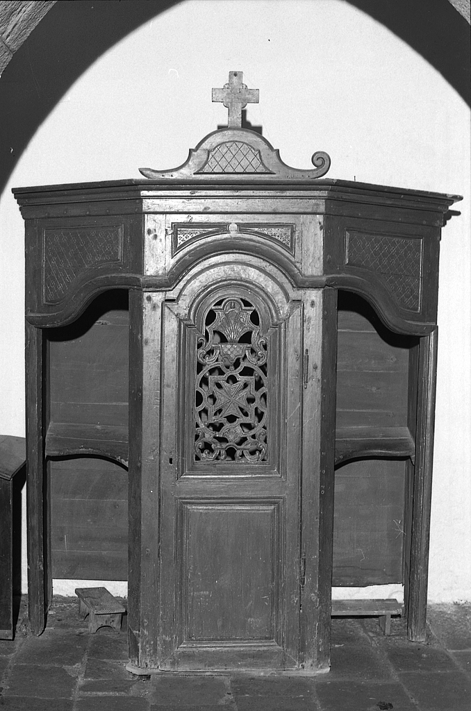 Confessionnal à trois pans surmonté d'une large corniche galbée formant l'encadrement ; vantail central ajouré.