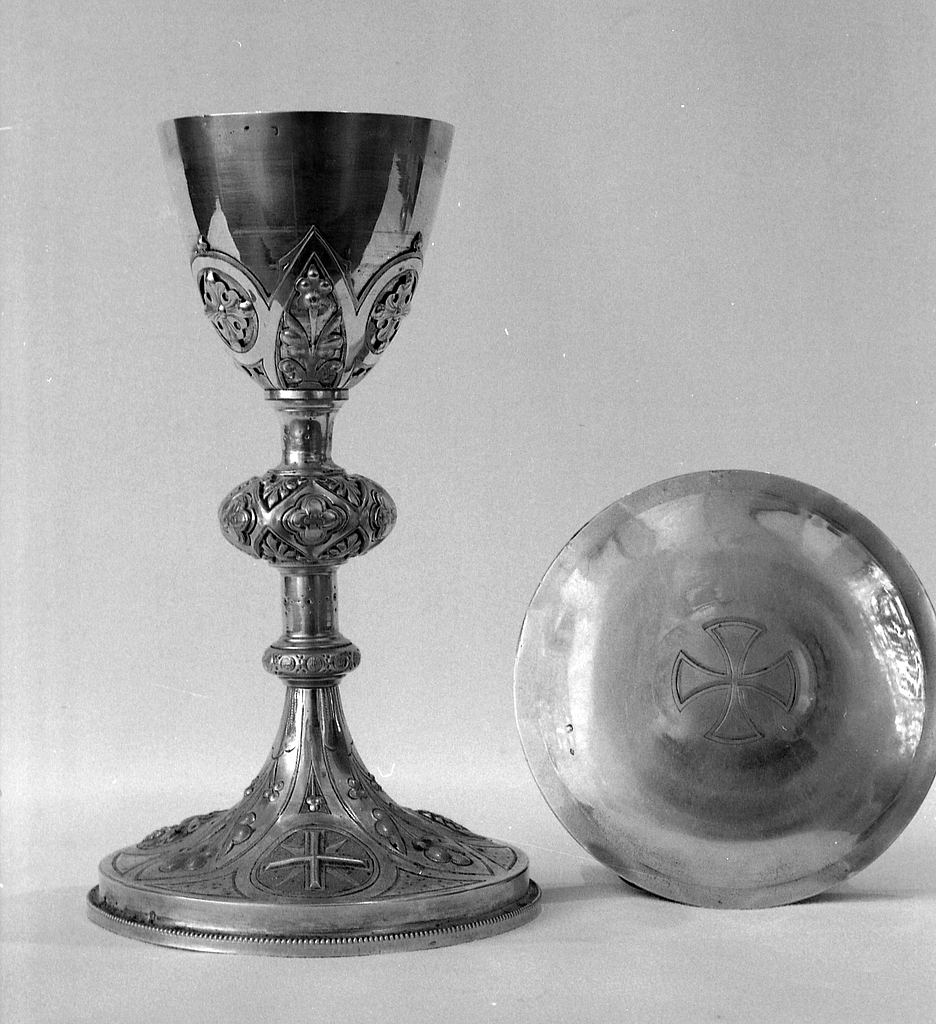 Ornementation (à croix, sur patène) ; ornementation (à arcature gothique, sur fausse coupe)..
