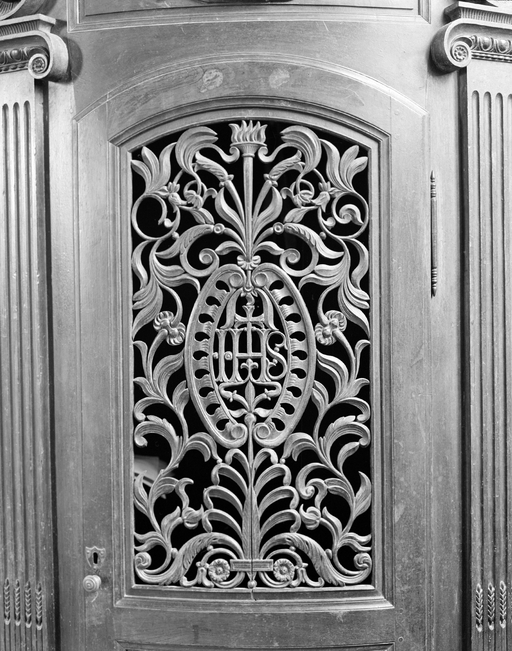 Vantail central ajouré ; couronnement en forme de dôme. Bâti à coupe droite ; vantail, coupe d'onglet.