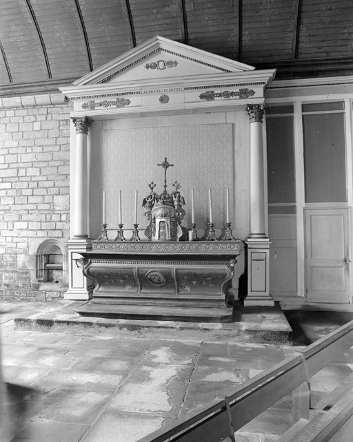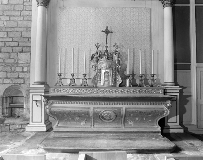 Ancien maître-autel ; retable : tableau disparu ; dais d'exposition au dessus du tabernacle disparu.